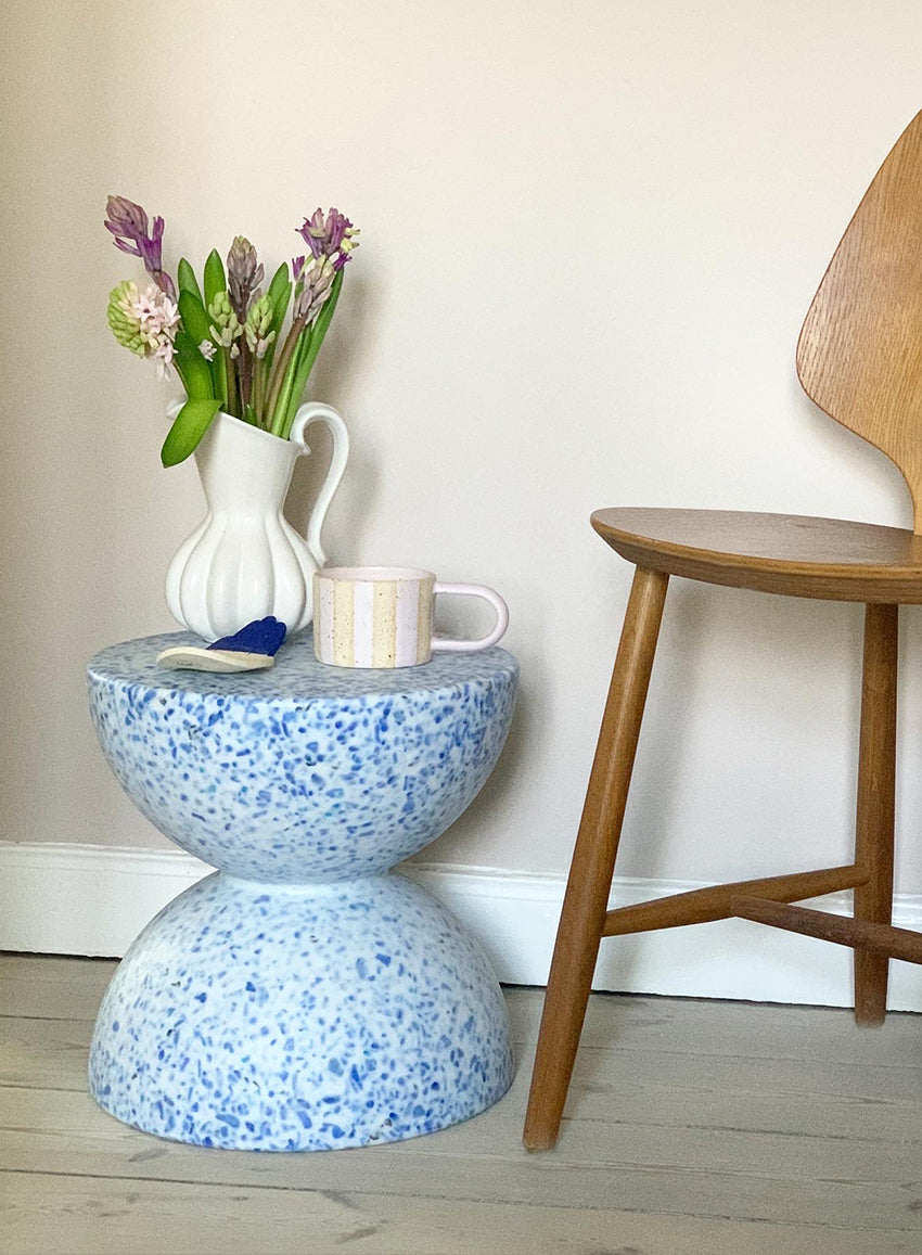 Pale Blue Moon Child is made of recycled containers from the fishing industry. It is a stool for children or a small table, both indoor and outside. Two on top of each other create a full moon and two half mons. The surface is easy to clean and tolerates most detergents. It is robust and weather resistant. Note that the colours vary a little from product to product. If you wish to purchase a larger amount you are welcome to contact us at info@wildstudiocph.com